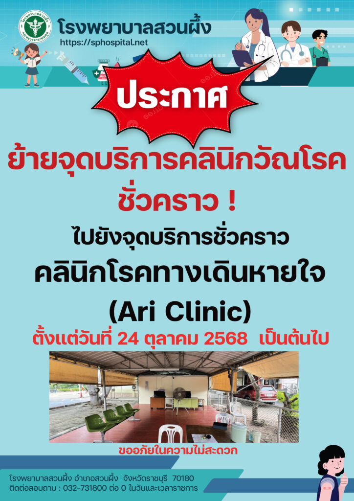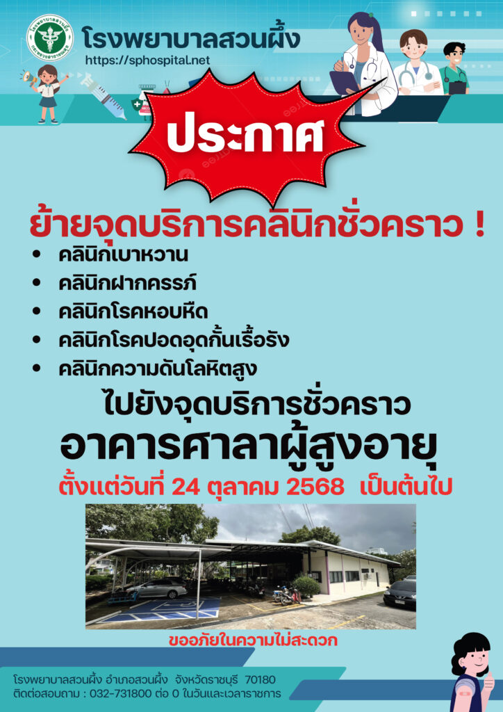 เนื่องจากมีการปรับปรุงอาคารผู้ป่วยนอก โรงพยาบาลสวนผึ้ง ขอประชาสัมพันธ์จุดให้บริการผู้ป่วย และคลินิกพิเศษต่าง ๆ ดังต่อไปนี้